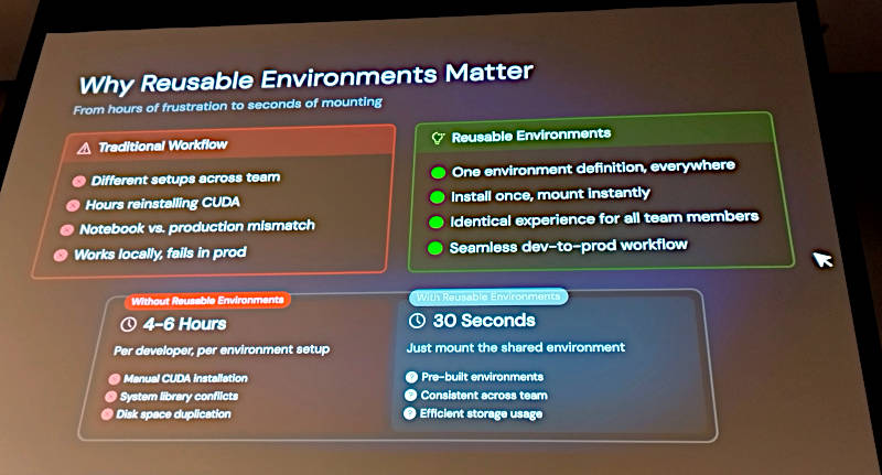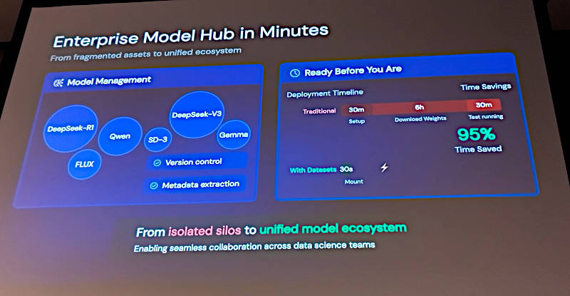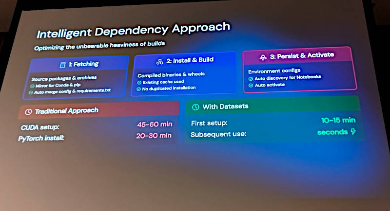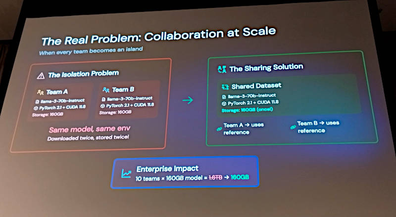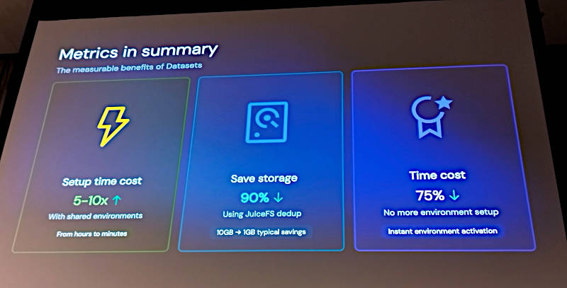 ここでセットアップ時間の短縮、データセットの再利用によるストレージの削減などを挙げて、Datasetによる効果を紹介した。これ以外にもネームスペースを使ったデータセットの再利用、モデルをカタログ的に利用可能にしたことなども紹介されている。