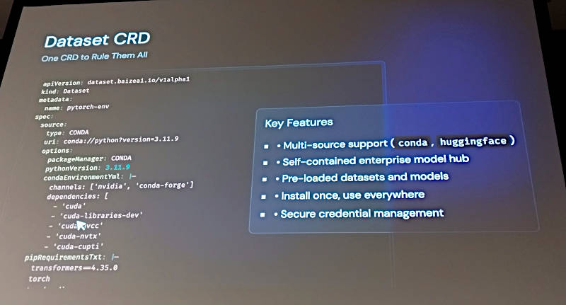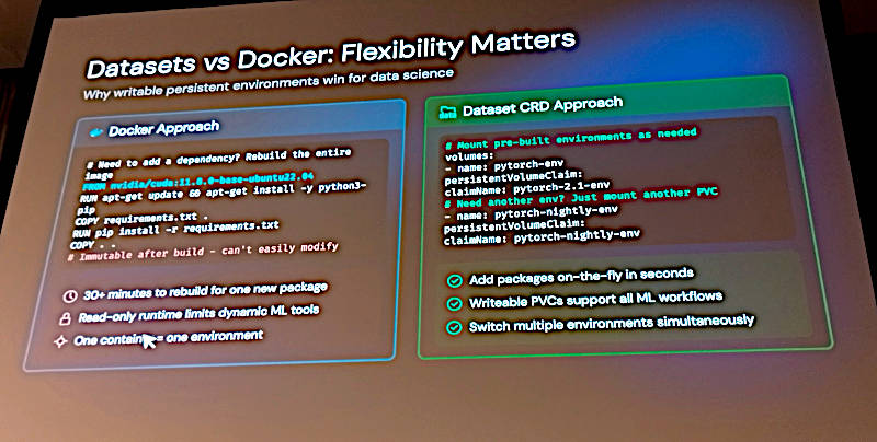 ここではこの後に解説されるDatasetというKubernetesのカスタムリソースを用いたツールに関して紹介しているが、この後にプレゼンテーションを行ったZhang氏は問題をより掘り下げて紹介しているため、やや唐突に回答が提示されてしまった感は否めない。