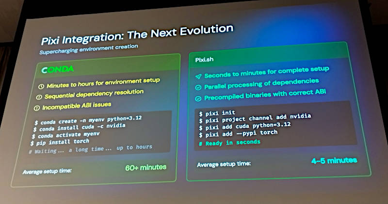 ここでもインストールなどのセットアップにかかる時間が大幅に削減されていることを説明した。Pixiについては以下の公式ページを参考にして欲しい。PixiはRustのパッケージマネージャーであるCargoを参考にして、CONDAの置き換えを目的に開発されているという。LLMにおけるPythonの問題点が主題のこのセッションにおいては必要なピースということだろう。