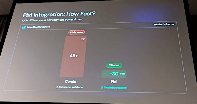 CONDAとPixiのセットアップ時間の比較を見せて解説。ここではCONDAの45分に対して、Pixiは30秒という処理時間が紹介されているが、主な違いはシーケンシャルに処理を行うCONDAに対して、Pixiは並列処理を行うことである。これこそがPixiが高速な要因だ。