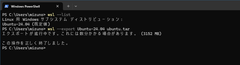 上記の例では、Ubuntu-24.04というディストリビューションが1つだけインストールされています。これをバックアップしてみます。WSL環境をバックアップするにはwsl --exportコマンドを使います。このコマンドは、指定したディストリビューションの全体をtarアーカイブとしてエクスポートできます。
