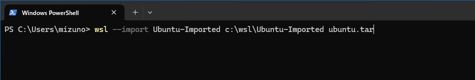 $ wsl --import Ubuntu-Imported C:\wsl\Ubuntu-Imported ubuntu.tar