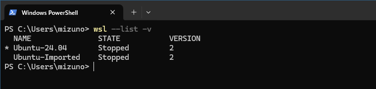 $ wsl --list -v NAME STATE VERSION * Ubuntu-24.04 Stopped 2 Ubuntu-Imported Stopped 2