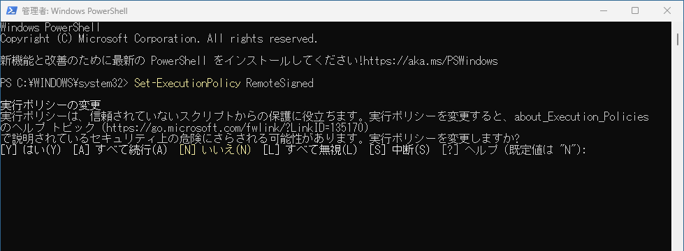 まず、管理者権限でPowerShellを開き、以下のコマンドを実行します。これはインターネットからダウンロードしたスクリプトは信頼された発行元による署名が必要で、ローカルで自作したスクリプトは署名なしで実行できるというポリシーになります。
