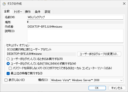 - セキュリティオプション: ユーザーがログオンしているかどうかに関わらず実行する