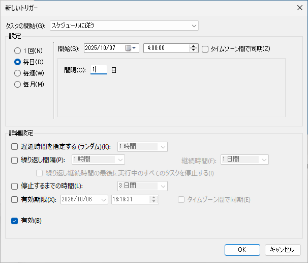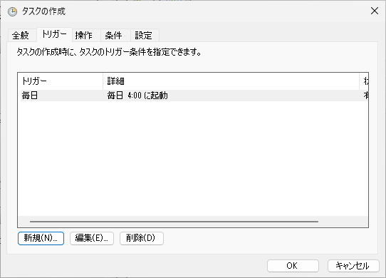 「トリガー」タブを開き「新規」ボタンをクリックします。「新しいトリガー」ダイアログが開くので、以下の内容を入力してOKをクリックします。