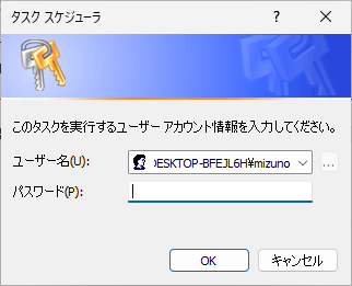 最後にOKをクリックしてタスクを保存します。タスクを実行するユーザーの確認が表示されるため、そのユーザーのパスワードを入力してください。