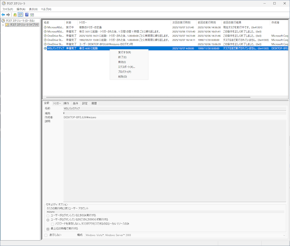 設定が完了したら、手動でタスクを実行して動作を確認しておきましょう。左のコンソールツリーから「タスクスケジューラライブラリ」をクリックします。タスクの一覧が表示されるので、作成した「WSLバックアップ」を右クリックし、コンテキストメニューから「実行する」をクリックします。これでタスクが実行され、バックアップが作成されることを確認してください。当然ですが、翌日の設定した時刻にもタスクが起動することを確認しておきましょう。これで毎日、WSL環境のバックアップを自動で取得できるようになりました*。