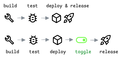 まず、もしアプリケーションの挙動を外部の設定だけで変えられるなら、ソースコードのデプロイと機能のリリースを切り離すことができます。これは「コードは本番環境に存在するが、機能はまだ公開しない」という状態を可能にし、リリースの柔軟性を大きく高めることに繋がります。また、この仕組みを環境ごとに設定すれば、本番環境では無効、開発環境では有効、といった切り替えも容易に行えるため、環境差分をブランチではなく変数で統一的に管理できるようになります。