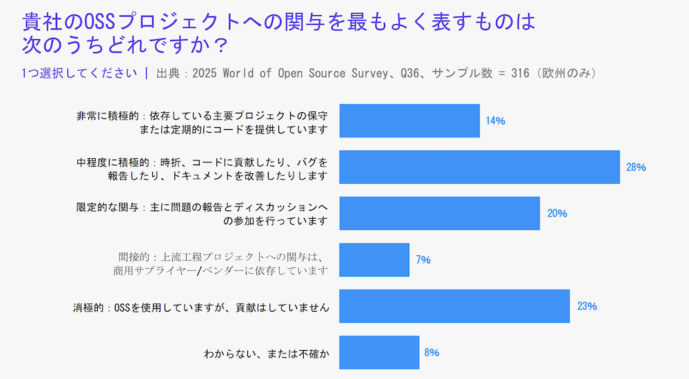 欧州でもOSSが広く利用されており、そのメリットも高く認識されています。しかしながら、組織によってオープンソースの成熟度にはばらつきがあります。下図は依存しているOSSプロジェクトへの貢献について、14%が非常に積極的、28%が中程度に積極的である一方、組織の30%はOSSを使用するものの、貢献していない、もしくは第三者に依存している受動的な消費者であることを示しています。