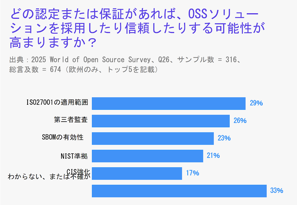同様にサイバーセキュリティのベストプラクティスに関する認知度も低く、回答者の33%はOSSソリューションの採用や信頼を高める認証や保証が分からない、または確信が持てないと回答しています。とはいえ、下図が示すようにISO27001の適用範囲(29%)、第三者監査(26%)、ソフトウェア部品表(SBOM)の有効性(23%)が、OSSプロジェクトのセキュリティに対する信頼を高める可能性が最も高いことが示されています。