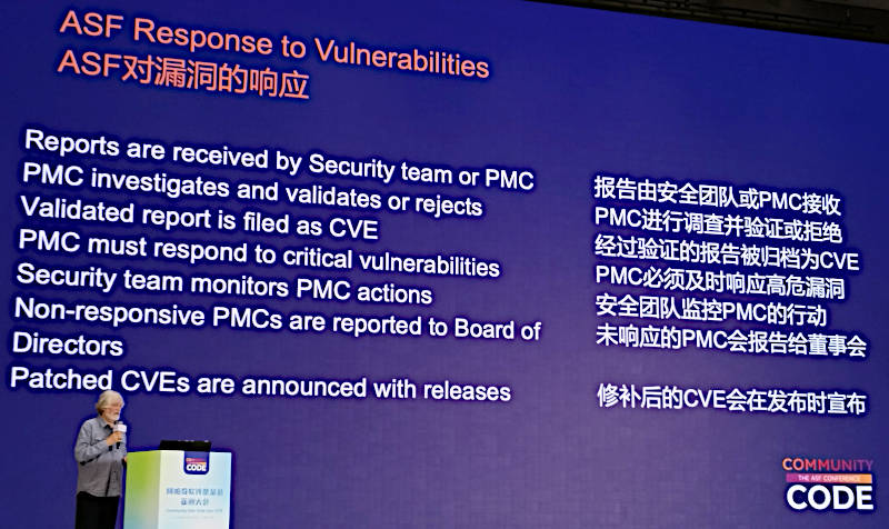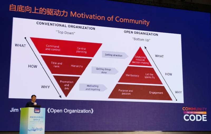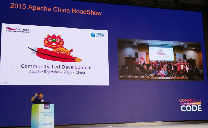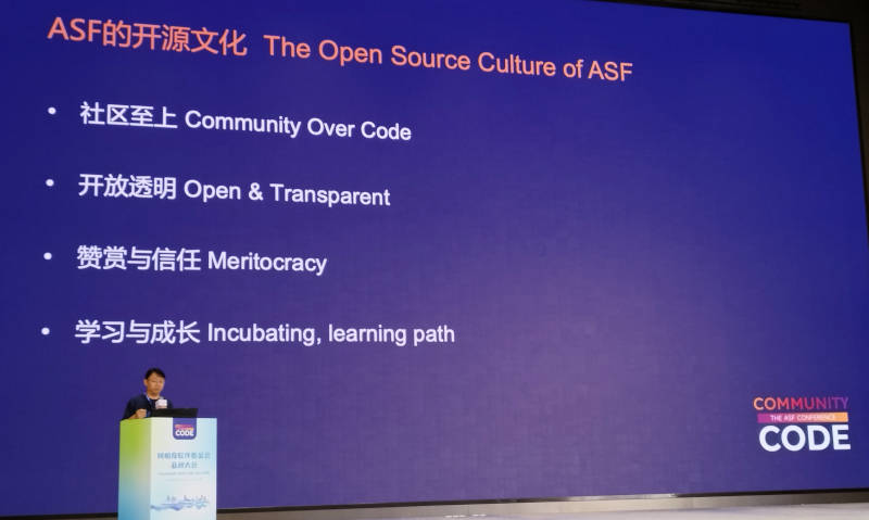 Jiang氏はオープニングのキーノートとして、中国のオープンソースがASFのブランドの下で活発に開発されていることを示したと言える。カンファレンスのスポンサーやサポーターを紹介した後に、ASFのオープンソースカルチャーを紹介した。