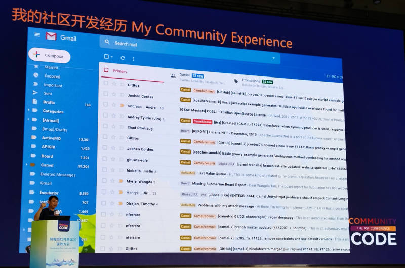 オープンソースがボトムアップで始まるというのはRed HatのかつてのCEO、Jim Whitehurst氏の著書、「Open Organization」からの引用である。オープンソースプロジェクトへの貢献というスライドにはJiang氏のGmailのスクリーンショットが使われており、主にApache Camelに関するやり取りなどが記録されているが、北京在住のJiang氏が欧米とのやり取りにはGoogleのサービスを使っているというのは処世術といったところだろう。