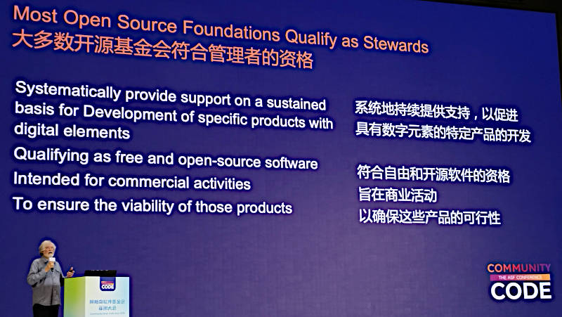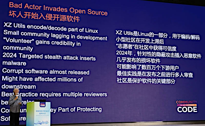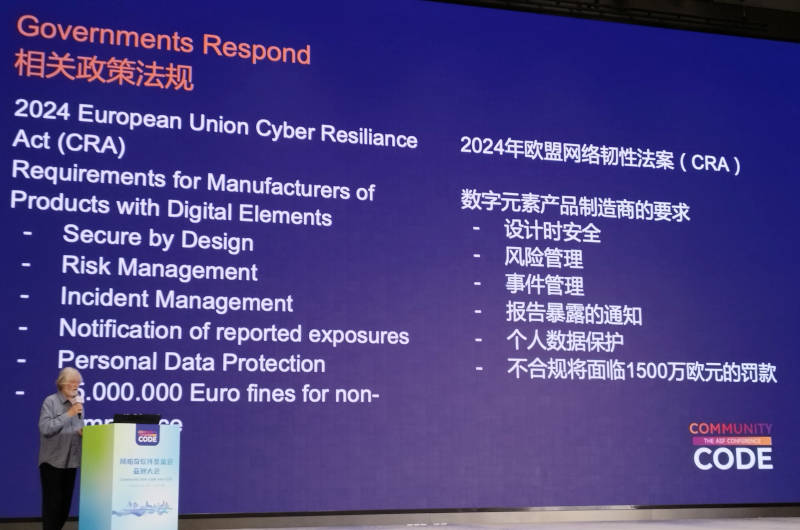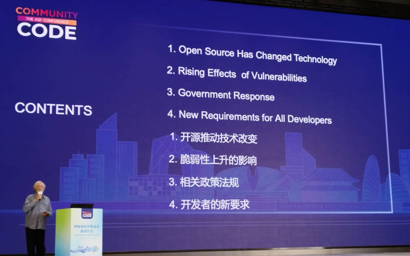 セッションの内容は、オープンソースのインパクトを紹介した後に脆弱性が増加していること、各国政府による規制、そしてすべてのデベロッパーが意識しないといけないことなどだ。内容を英語と中国語で併記してあるのは、いかにも中国からの参加者に対する気遣いというところだろう。これ以降のスライドもすべて英語/中国語併記となっていた。