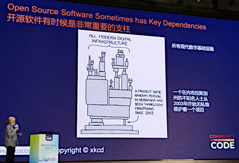 オープンソースが今やすべてのソフトウェアの90%を占めるようになっていることや、100以上のオープンソースに特化した組織が存在することでオープンソースにおいて多くのイノベーションが起こっていることを紹介。ここでxkcdの有名なイラストを使って、多くのインフラストラクチャーを支えているのはごく少数のエンジニアの自己犠牲であり、現実のインフラストラクチャーが脆弱なバランスの上になりたっていることを紹介した。xkcdのオリジナルのイラストは以下から参照できる。