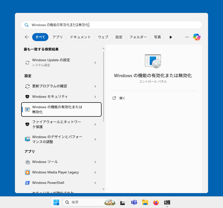 1. まず、WSL1を使うため「Linux用Windowsサブシステム」を有効にします。スタートメニューから「Windowsの機能の有効化または無効化」を開いてください。
