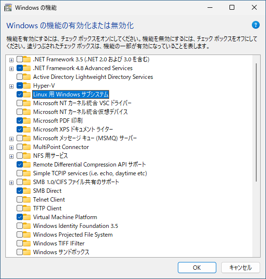 2. 「Linux用Windowsサブシステム」にチェックを入れて「OK」をクリックします。インストールが完了したら、Windowsを再起動してください。