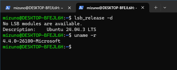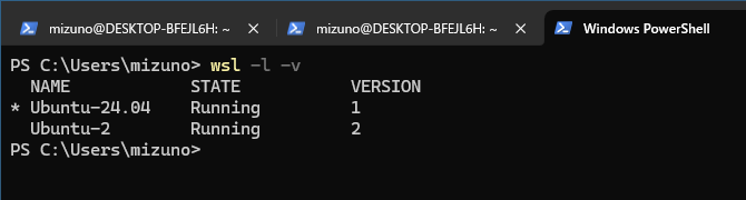 同一のUbuntu 24.04をWSL1と2、それぞれ用意しました。