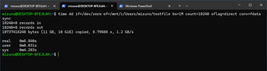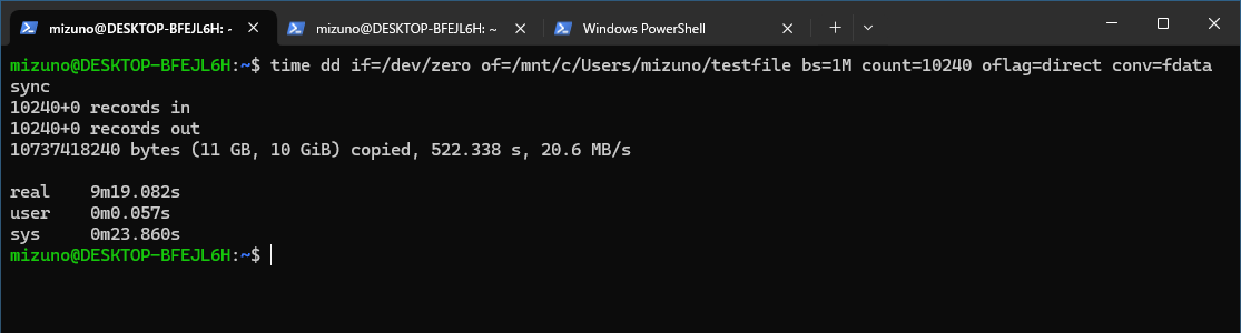 $ time dd if=/dev/zero of=/mnt/c/Users/(Windowsのユーザー名)/testfile bs=1M count=10240 oflag=direct conv=fdatasync