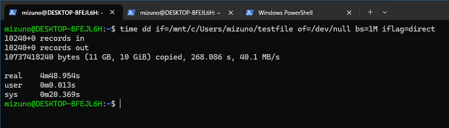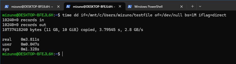 $ time dd if=/mnt/c/Users/(Windowsのユーザー名)/testfile of=/dev/null bs=1M iflag=direct