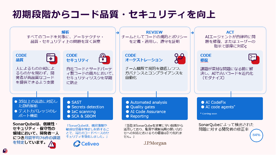 このように、SonarQubeは堅牢なルールベースによるコードの静的解析と、柔軟なLLMベースの技術を組み合わせることで開発者の負担を軽減し、開発者がより創造的な業務に集中することを支援するツールだ。