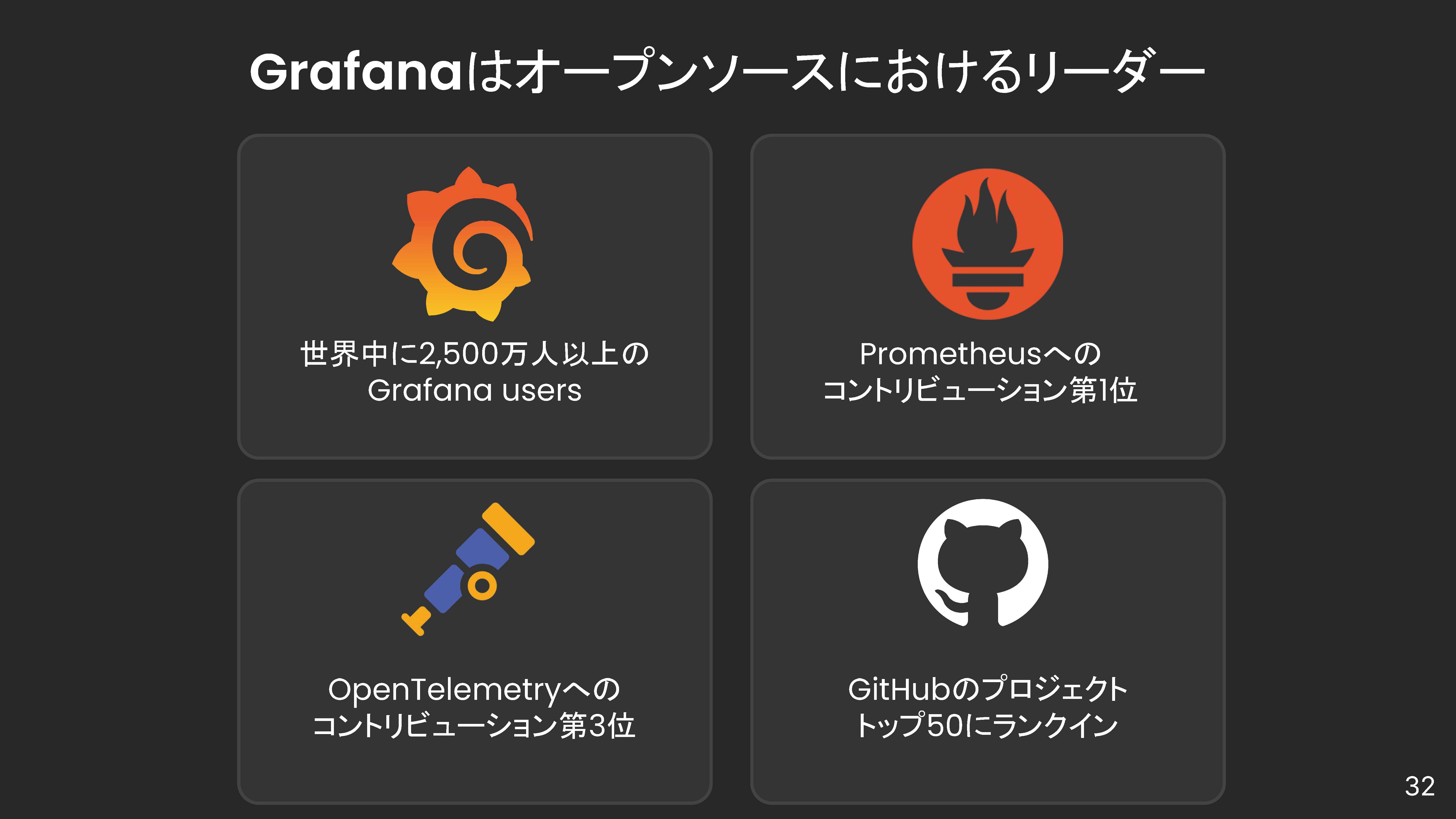 発表会では日本のユーザーも登壇し、ユーザー目線でのGrafanaの魅力を伝えた。株式会社グリーは2015年からGrafanaをモニタリング基盤として採用し、グループ全体の標準スタックとして活用している。Grafanaのメリットとして、ダッシュボードの民主化、周辺のエコシステムと連携しやすいこと、利用者自身の課題を標準化された手法で解くことができることなどを挙げた。