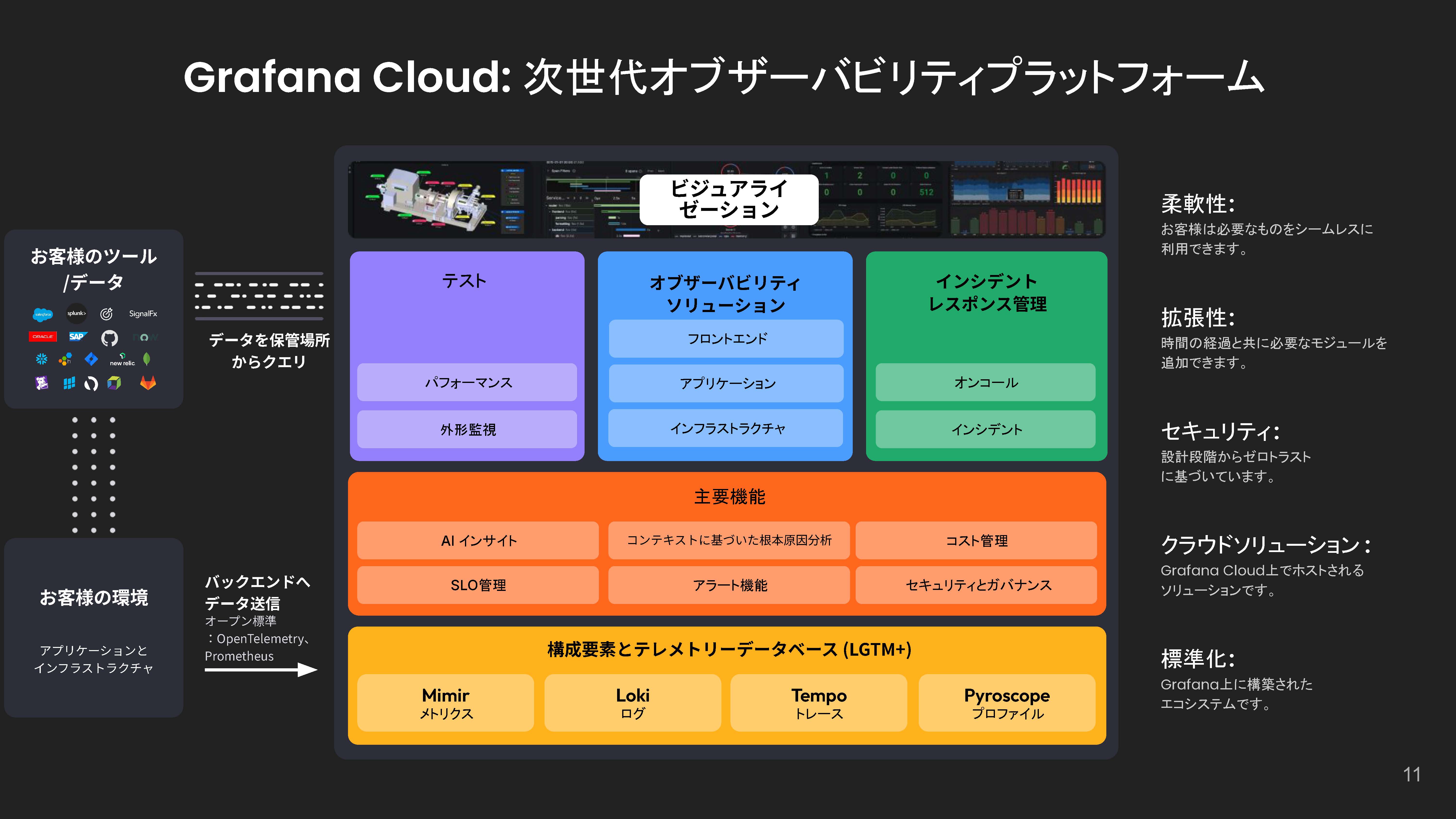 主な特徴として挙げられるのが「Datadog」「Elasticsearch」など様々なツールやプラットフォームと接続できるため、サイロ化しがちなデータを統合し、可視化と分析ができること。膨大なログやメトリクスから本当に有用な情報のみを抽出するAdaptive Telemetryにより、オブザーバビリティにかかるコストを大幅に削減できること。そしてAIを統合した「Grafana Assistant」により、現場のエンジニアからリーダー層、経営層まで、あらゆる層にオブザーバビリティの恩恵を提供できることだ。