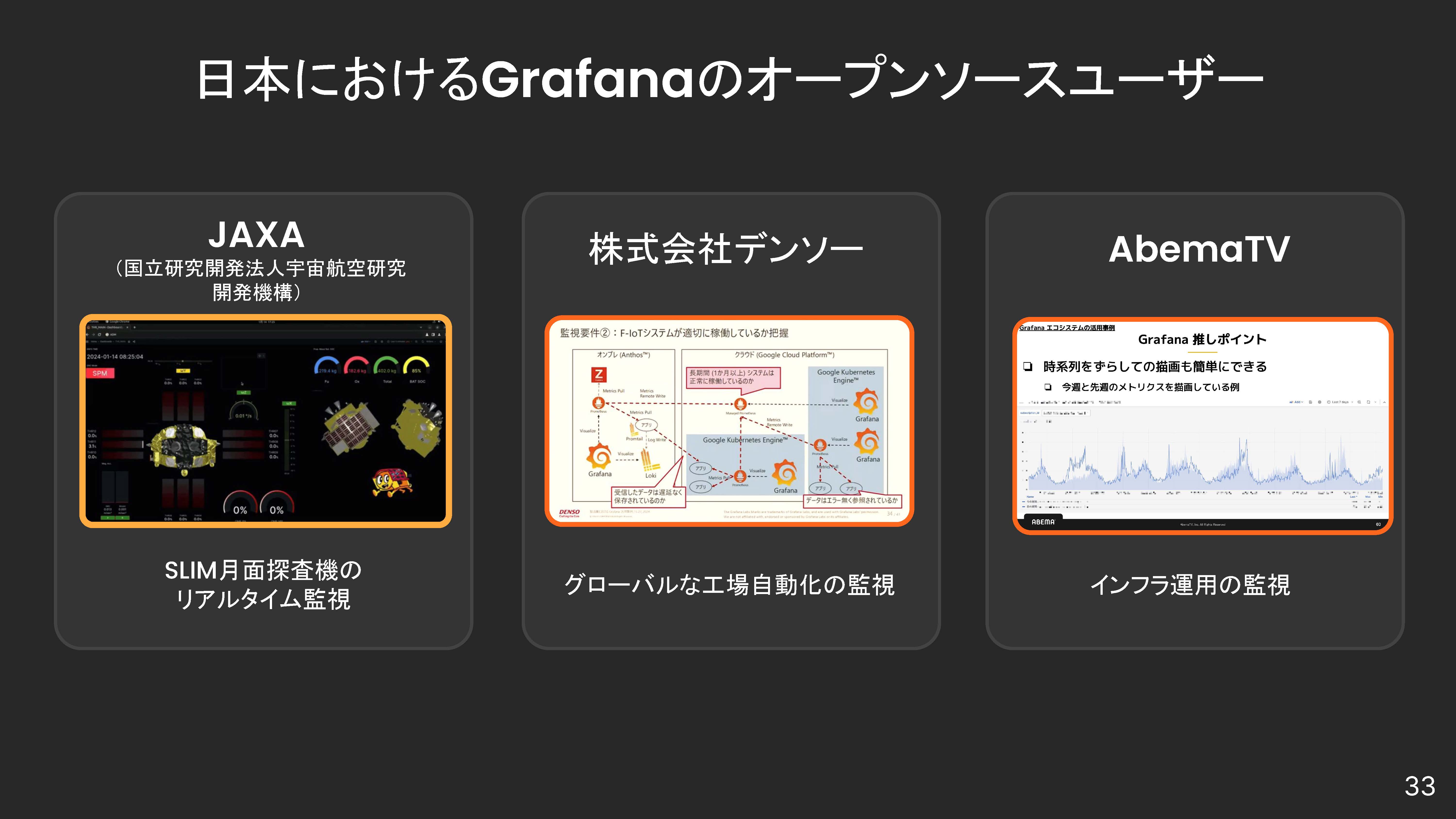 実際、日本法人設立以前からGrafanaのコミュニティは日本で大きく成長してきた。JAXAはSLIM月面探査機のリアルタイム監視にGrafanaを採用し、またデンソーは世界中の工場からのIoTデータを可視化するためにGrafanaを導入している。サイバーエージェントはGrafanaをAbemaTVのインフラ運用監視に利用しており、番組配信で問題があれば即座に発見できる体制を構築した。さらに、2025年初めに開催されたカンファレンス「ObservabilityCON on the Road Tokyo」は参加チケットが完売するなど、既に日本市場での力強い勢いを確立している。