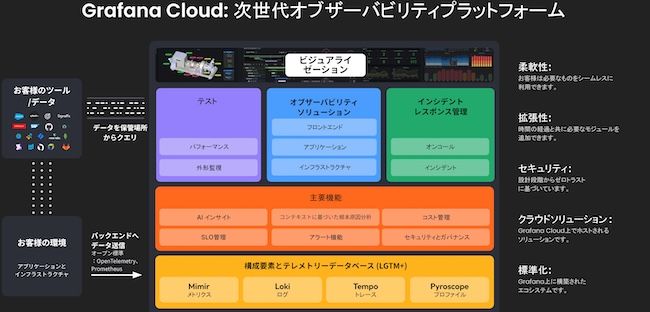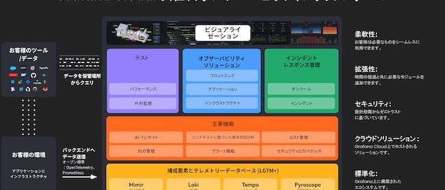 現在、同社はSaaSにも力を入れている。主力製品「Grafana Cloud」はメトリクス、ログ、トレース、ダッシュボードを1か所に統合し、アプリケーション・インフラ・サービス全体を包括的に監視できるオブザーバビリティプラットフォームで、「Grafana」「Loki」「Mimir」など同社が開発するOSSを基盤に構築されたフルマネージドのサービスだ。