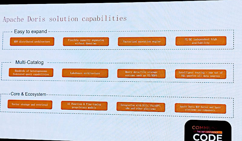 セッションのタイトルは「Apache Doris AI Exploration and Practice」というもので、プレゼンターはYijia Su氏。セッションのページからは「SelectDBシニアソリューションアーキテクト」というタイトルが読み取れる。SelectDBはBeijing Flywheel Data Technologyが開発するApache Dorisの商用版ということを考えると、Apache DorisのコミッターであるSu氏がこのセッションを担当するのは妥当と言える。Apache DorisはBaiduがオンライン広告の分析のためのツールとして開発したソフトウェア(当時の名称はPalo)で、2017年にオープンソースとして公開、2018年にBaiduからThe Apache Software Foundationに寄贈された。SQLとしてはMySQL互換であることが記載されているが、当時のBaiduのオンライン広告分析にはMySQLが使われており、その処理速度とシャーディングの運用に問題を抱えていたBaiduがその問題を解決するために開発したという背景を考えれば、分散並列処理、高速性などが機能として強化されているのは理解できる。