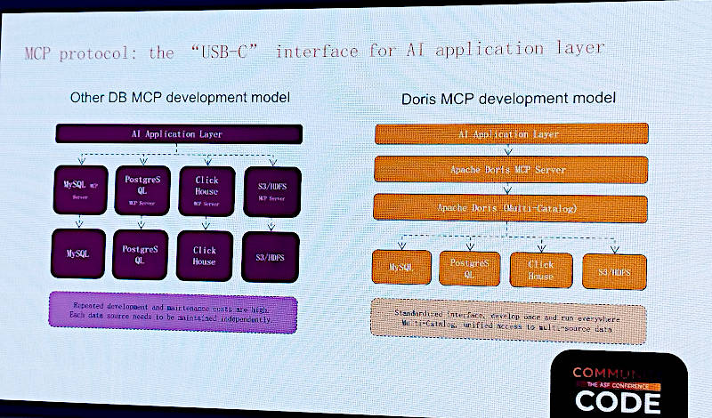 ここではAnthropicが提唱したMCP(Model Context Protocol)について説明を行った。ここでも従来の各種データベースを接続するMCPとDorisのMCPサーバーによる連携が異なることを説明。MySQLやPostgreSQL、ClickHouseなどが個別にMCPサーバーを使う必要があるのに比べてDorisではそもそもMySQL互換ということもあり、さまざまなデータソースと連携して実行できることを強調している。