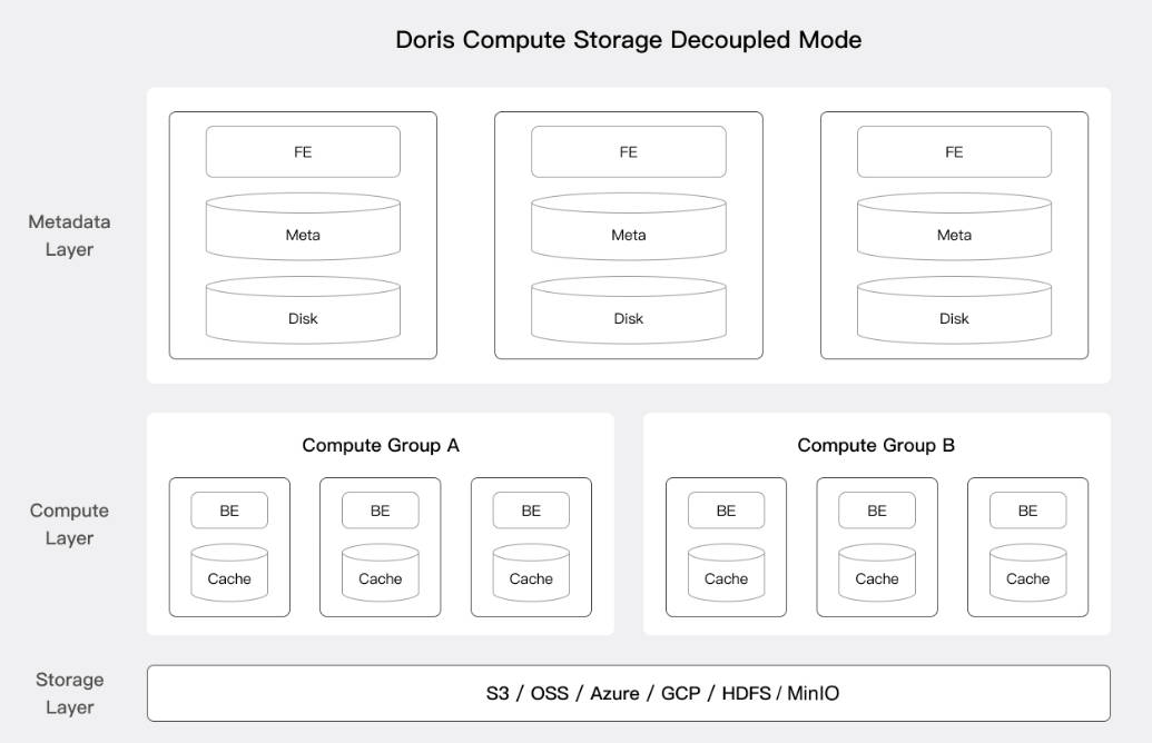 ポイントはフロントエンドとバックエンドが分離されていること、さらに演算を行うインスタンスとストレージも分離されており、メタデータとキャッシュを持つフロントエンド、分析を行うバックエンド、そして実際のデータを保持するS3やHDFSなどのストレージがレイヤーとして構成されているという。