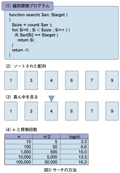 詳細は省きますが、この方法で目標物を見つけるまでの平均探索回数はlog(n)であることがわかっています。これがどれくらい速いかは図3(4)の比較表を見れば一目瞭然でしょう。データ件数が1,000件のとき、線形探索では平均500回の比較を行いますが、2分探索では約10回の比較で済みます。
