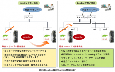 これはHAクラスタとして機能はしていても、HAシステムとして堅牢であるとはいえません。bondingはサービス継続だけでなくシステム全体の高可用性にもかかわる非常に重要なテクノロジといえます。