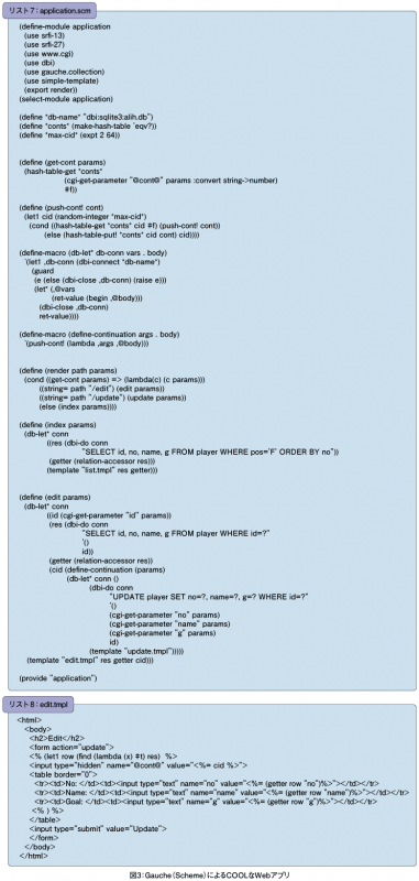リスト7のedit関数はこのように書かれています。define-continuationはマクロで「変更データを取得しRDBを更新」を行うlambda式を、継続用のpush-cont!関数を使ってハッシュ(hash)に格納しています。