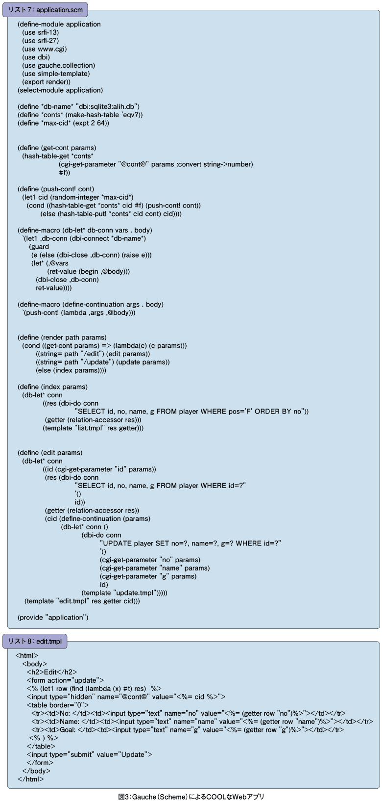 さらに、かなり短い行でテンプレートエンジンが作れたり、マクロで簡潔な記述ができたり、継続を使って複数のページにまたがる処理を1つの関数で簡単に書けたりするGaucheのシンプルさ、強力さを感じ取っていただけたら幸せです。