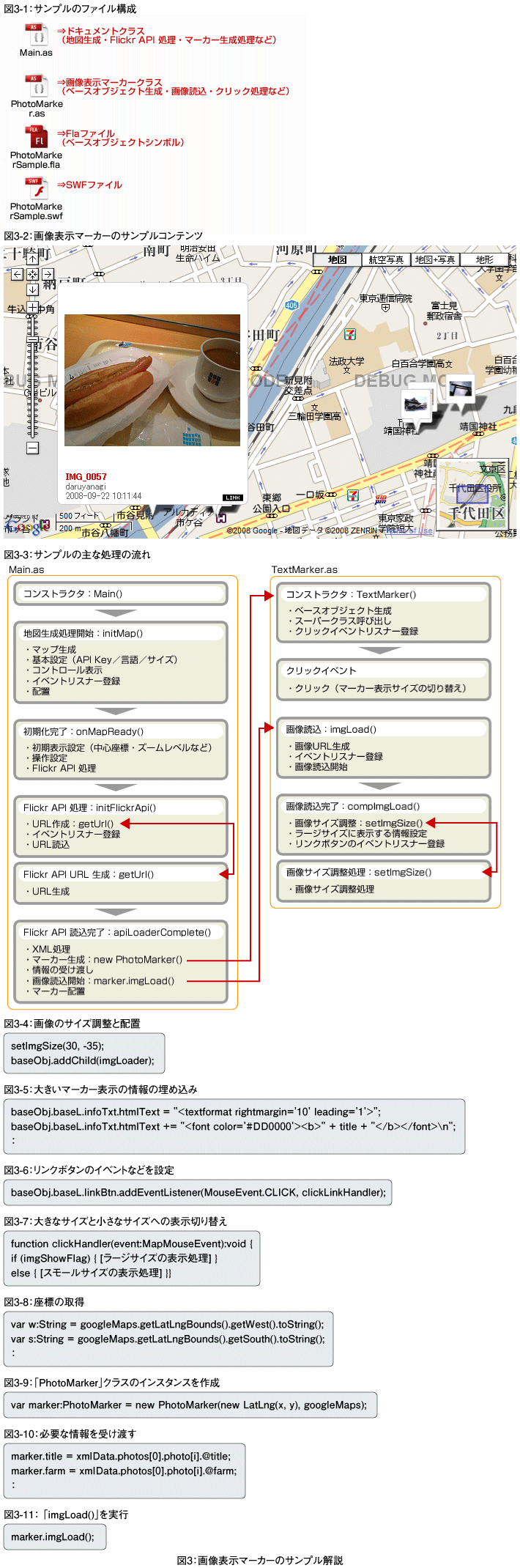 続いてドキュメントクラス「Main.as」を見ていきます。テキスト表示マーカーのサンプルと基本的な流れは変わらないのですが、地図生成後、「initFlickrApi()」が実行され、Flickr APIの処理が行われます。今回は地図の初期表示領域にある写真を検索しています。