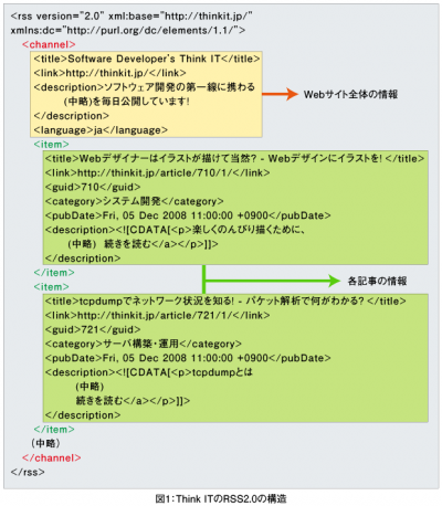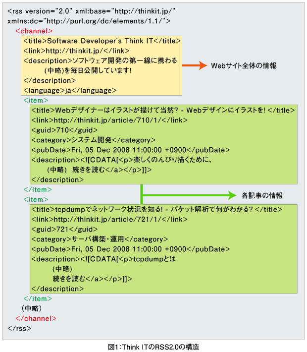 Think ITのRSS2.0(http://thinkit.jp/rss/rss20.xml)の構造を図1にまとめました。
