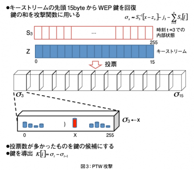 つまり、ARPパケットでなくとも、暗号化されたパケットからキーストリームを得ることができれば、PTW攻撃は可能となる。よって、連続する15バイトではなく、さらに短いキーストリームでもWEP鍵を導出可能な方法や、さらに長いキーストリームの情報を利用して、PTW攻撃よりも効率的にWEP鍵を導出する方法も考えられる。