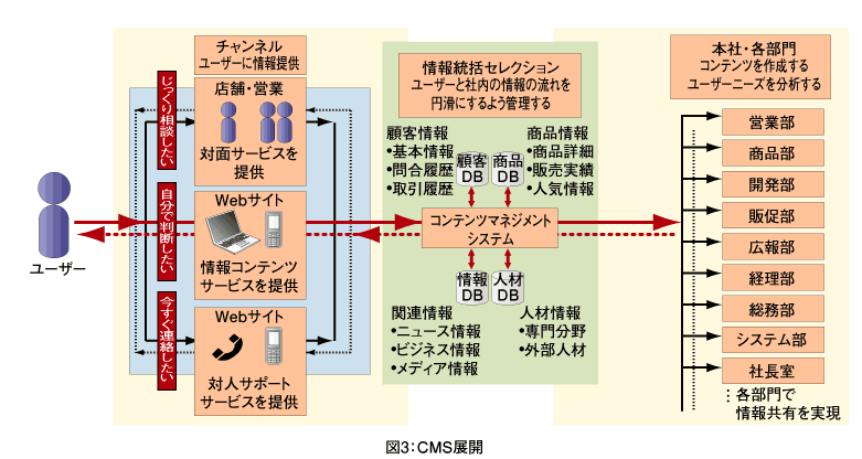 これらの取り組みは、ツールとしてのCMS(コンテンツ・マネジメント・システム)を導入することによって、さらに効率的に実現することが可能です。情報をコンポーネントとして管理する方法や、体制・ルールのシステマチックな運用は、CMSと極めて親和性が高く、スムーズなシステム移行が可能です。1000ページを超えるような大規模Webサイトが前提であれば、将来的な運用を見越したCMSツールの導入も有効なWebサイト戦略といえます。