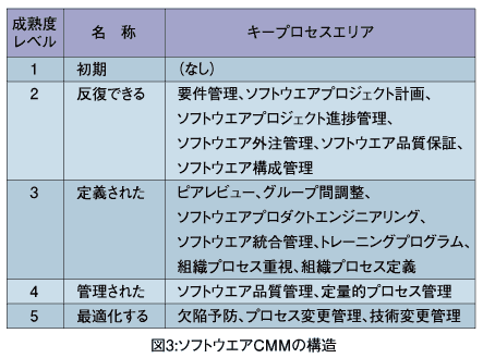 ソフトウエアCMM(SW-CMM)は、成長するソフトウエア能力の5段階を記述したものです。図3に示すように、1番目を除く各レベルは、キープロセスエリア(KPA)を定義しています(「ソフトウェア能力成熟度モデル 1.1版(公式日本語版)」詳細は参考文献)。