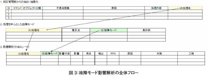 1つ目の表へのインプットは、不具合管理表や修正管理表です。また、3つ目が故障モード影響解析の結果になります。一般に故障モード影響解析と呼ばれる技法では、3つ目の表が得られた時点で作業は終了します。ここでは、得られた故障モード影響解析表をもとにこれから開発するソフトウエアにどうやって活用していくかについても紹介します。イメージとしては、過去の不具合管理表をもとに、これら3つの表を作りながら、起こりがちな不具合、起こる場所、優先度を決め、3つ目の表を得ます。3つ目の表の内容を使って、これから開発するソフトウエアでも起こりうる内容か、起こるとするならばどの機能や工程で防げるかを明らかにします。