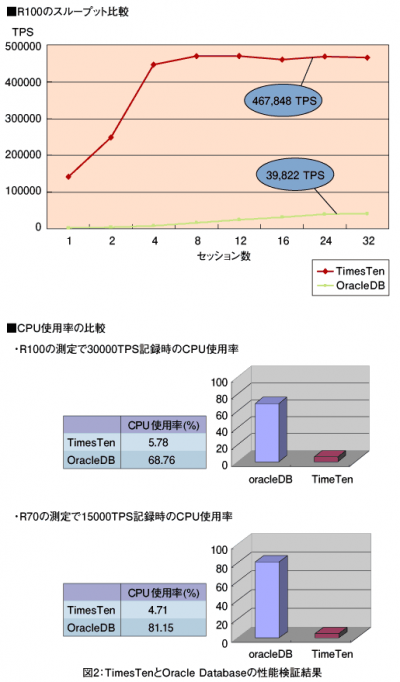 R70の試験で比較した場合、ディスクI/Oが発生する分さらに差は開いています。この結果からもTimesTenが非常に少ないリソースで高パフォーマンスを実現できていることがわかります。