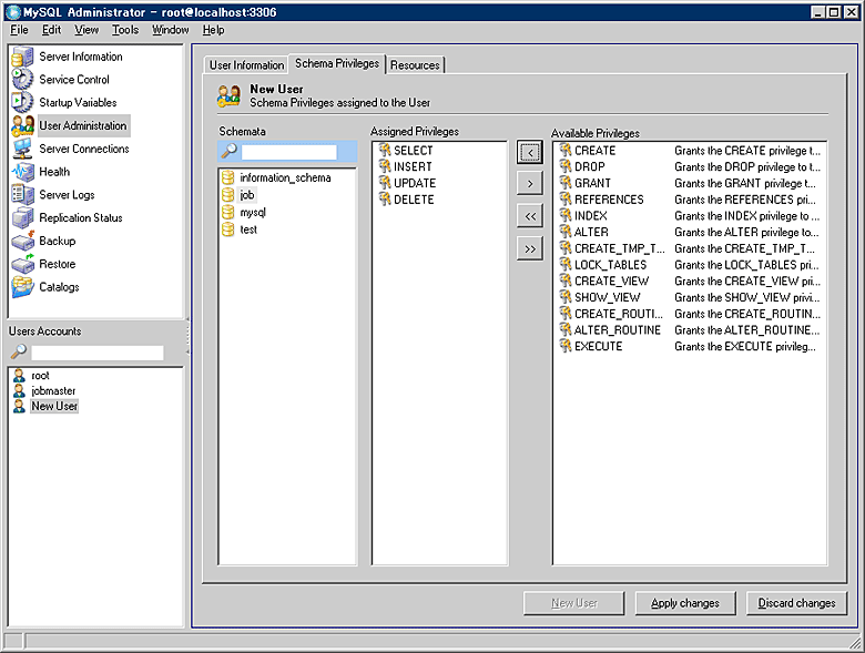 権限設定では、他の2つ(SQL Express EditionとPostgreSQL)がロールや割り当てなどの設定を前提に行うものに対し、MySQL Administratorはユーザ設定の1つの画面で直感的に行うことができ一番容易であった。