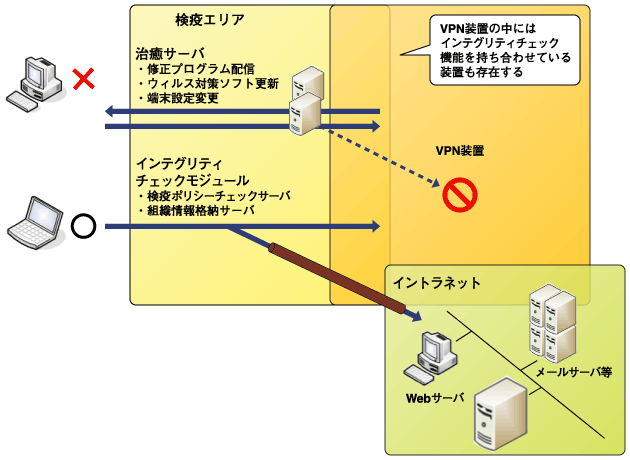 VPN検疫にはLAN検疫同様、隔離から検疫までのプロセスを行い、さらに不適合の場合にはアクセスを拒否するといったタイプのソリューションと、それに加えて治癒や設定変更などの高度な機能、詳細なログ管理機能が備わったソリューションが存在する。