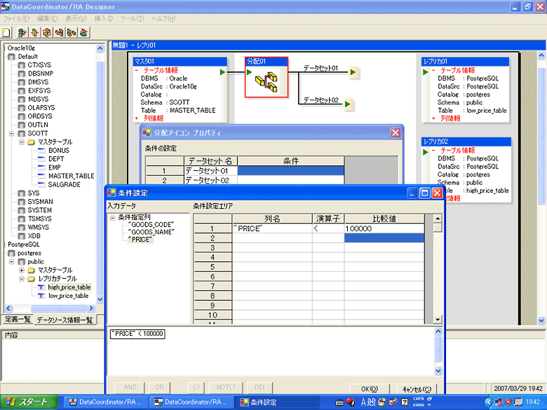 図5のように画面下側に「”price” < 100000」が表示されたら、その状態で右下の「OK」ボタンをクリックします。分配アイコンプロパティのデータセット01に設定した条件が表示されます。