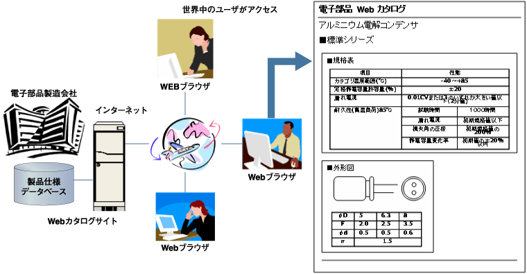 「Webカタログ」とは、製品カタログをInternet ExplorerなどのWebブラウザから閲覧することができるようにしたサービスまたはシステムのことを指す。紙の製品カタログとは違い、インターネットを通じて世界中からアクセスすることが可能で、かつリアルタイムに更新を行うことができる。