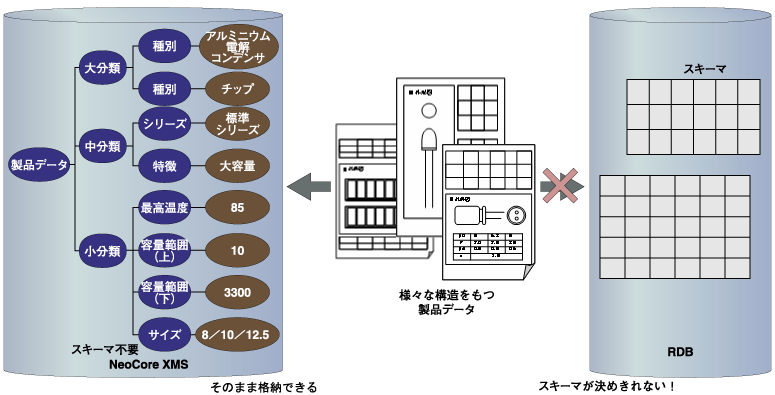 この課題を解決できるのがNeoCore XMSを採用した新しいWebカタログ管理システムだ。スキーマ不要のXMLデータベースであるNeoCore XMSなら、ビジネスのニーズにあわせ、スキーマを決めることなく製品のデータを格納できるのだ。