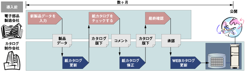 あくまで紙カタログが主でWebカタログが従であるため、新しい製品情報をWebカタログに載せるためには、本来ならば不要な紙カタログのための版下を作るという作業が発生していた。このために生じた時間のロスの結果として、最新の製品がWebカタログに載るまでに最長で数ヶ月もかかっていたのである。