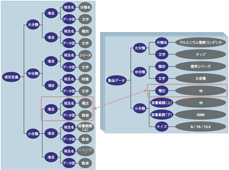 項目定義は、製品データにどのような項目が含まれていて、その項目のデータ型や単位が何かを示したXMLデータとなっている。例えば、ある製品データに「電圧」という項目があるかどうかは、この項目定義に記述される。製品には、大分類/中分類/小分類があり、項目定義は各分類の中にどのような項目があるのかを示している。この項目定義と製品データの関係は図5のようになっている。